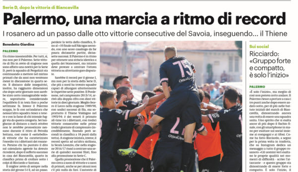 L'edizione odierna del "Giornale di Sicilia" parla di ritmo sfrenato del Palermo in serie D. Sette vittorie di fila -...