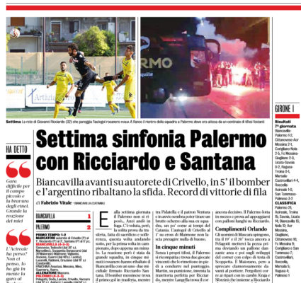 L'edizione odierna del "Corriere dello Sport" esalta la settima vittoria di fila del Palermo. Vittoria strappata coi denti a Biancavilla,...