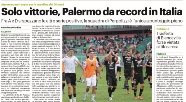 L'edizione odierna del "Giornale di Sicilia" esalta il Palermo, come unica squadra italiana a punteggio pieno. Tra Serie A, B,...