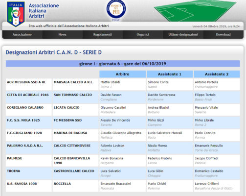 In alto, le designazioni arbitrali valide per la sesta giornata di serie D. Palermo-Cittanovese è stata affidata al signor Lovison...