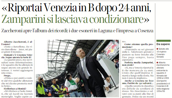 L'edizione odierna del "Corriere del Veneto" riporta le dichiarazioni di Alberto Zaccheroni, allenatore che ha allenato il club lagunare durante...