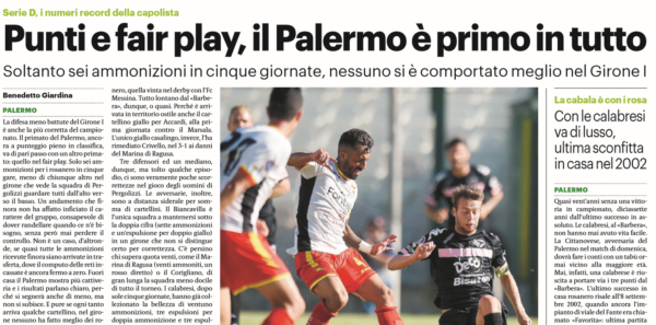L'edizione odierna del "Giornale di Sicilia" esalta i primati del Palermo nel girone I di Serie D. La difesa meno...