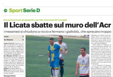 L'edizione odierna del "Giornale di Sicilia" si sofferma sul pareggio tra Licata e ACR Messina. 0-0, ma i padroni di...