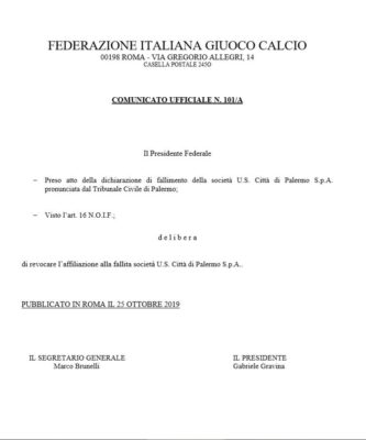 U.S. Città di Palermo: FIGC revoca affiliazione – il comunicato