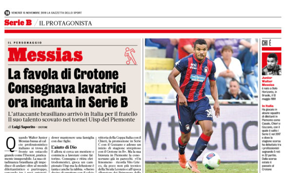 L'edizione odierna della "Gazzetta dello Sport" esalta le prestazioni di Walter Junior Messias, attaccante del Crotone. La sua cittadinanza brasiliana...