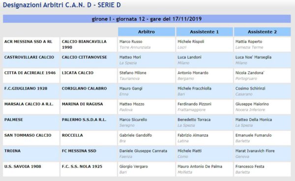 Sono state diffuse le designazioni arbitrali della 12a giornata del girone I di Serie D. Palmese-Palermo sarà arbitrata da Marco...