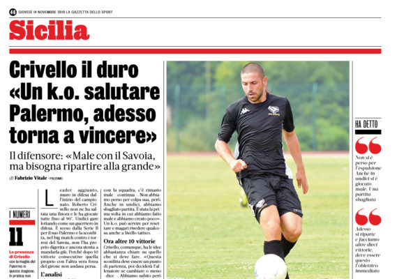 L'edizione odierna della "Gazzetta dello Sport" riporta le dichiarazioni di Roberto Crivello, difensore del Palermo: «La sconfitta l’abbiamo presa male,...
