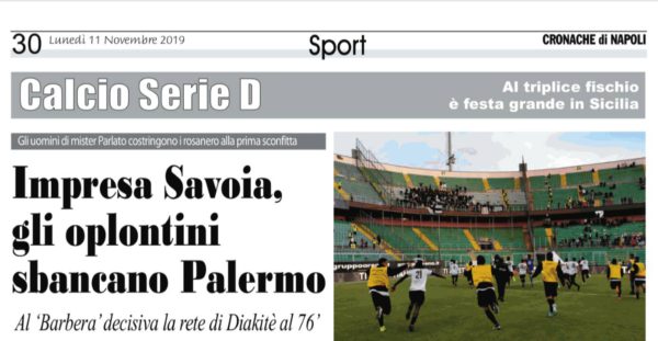 L'edizione odierna de "Il Roma" parla della sconfitta di ieri del Palermo contro il Savoia. "Una vera e propria impresa...