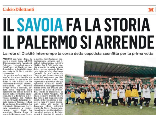L'edizione odierna de "Il Mattino" parla della prima sconfitta del Palermo subita ieri per mano del Savoia al Barbera. Vent'anni...