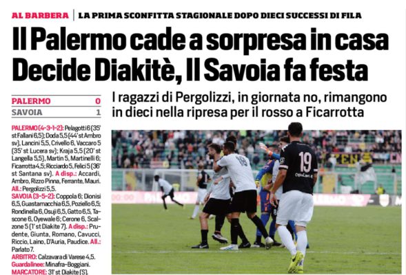 Corriere dello Sport: “Il Palermo cade a sorpresa in casa. Il Savoia fa festa”