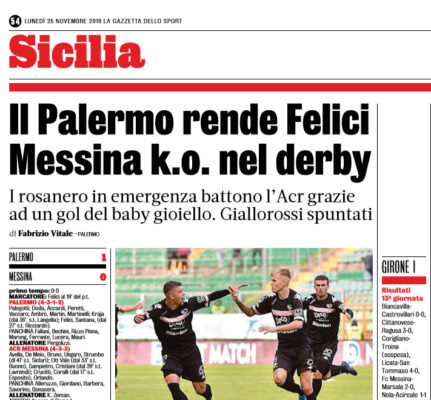 L'edizione odierna della "Gazzetta dello Sport" esalta la vittoria del Palermo nel derby contro l'ACR Messina. Era la vittoria più...