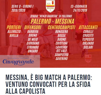 ACR Messina: “E’ big match a Palermo”. Ecco i convocati per il derby