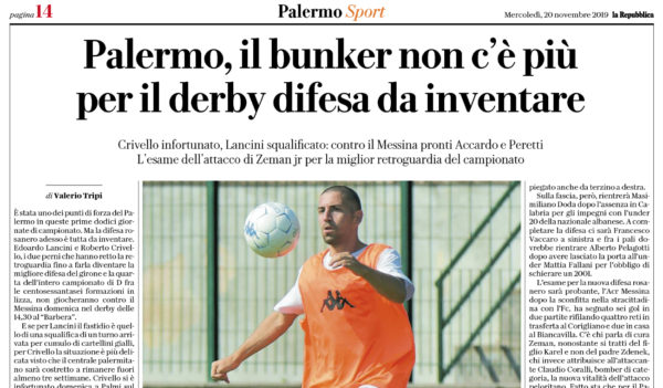 L'edizione odierna de "La Repubblica" analizza la preparazione del Palermo in vista della gara interna contro l'ACR Messina. La difesa...