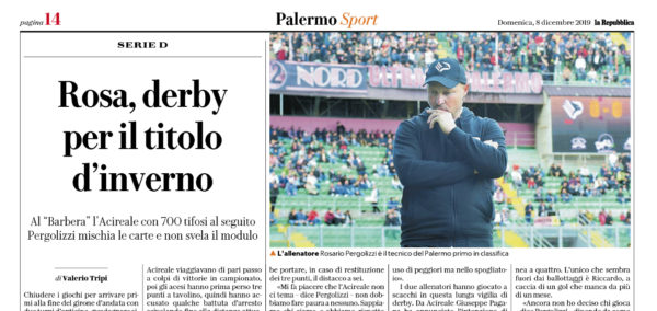 L'edizione odierna de "La Repubblica" si sofferma sulla sfida tra Palermo e Acireale. Una vittoria consentirebbe ai rosa di vincere...