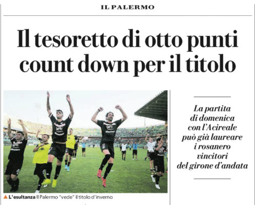 L'edizione odierna de "La Repubblica" si sofferma sul vantaggio in classifica del Palermo. Già domenica i rosanero potrebbero laurearsi campioni...