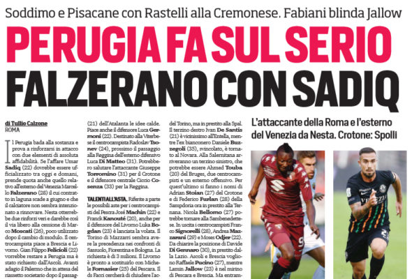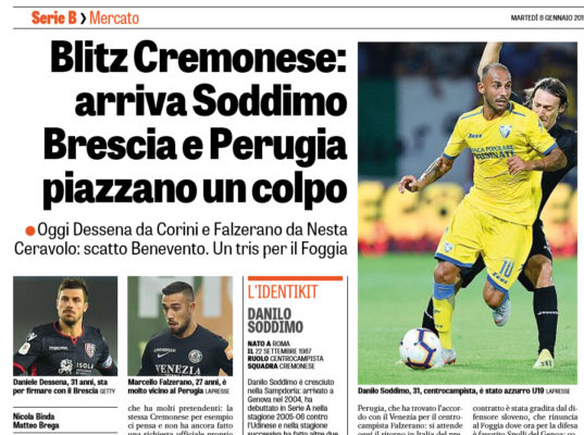 Gazzetta dello Sport: “Blitz Cremonese: arriva Soddimo. Brescia e Perugia piazzano un colpo. Tutte le trattative del giorno in serie B”