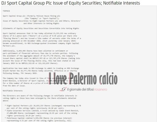 Attraverso il sito del listino NEX di Londra, la Sport Capital Group Plc annuncia di aver aumentato il proprio capitale...