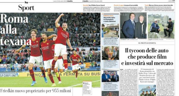 Repubblica: “Roma alla texana, Friedkin nuovo proprietario per 955 milioni. Pallotta prende subito altro club?”