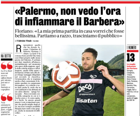 L'edizione odierna del "Corriere dello Sport" riporta le dichiarazioni di Roberto Floriano, attaccante del Palermo: «Bari? Mi sono fatto male e...
