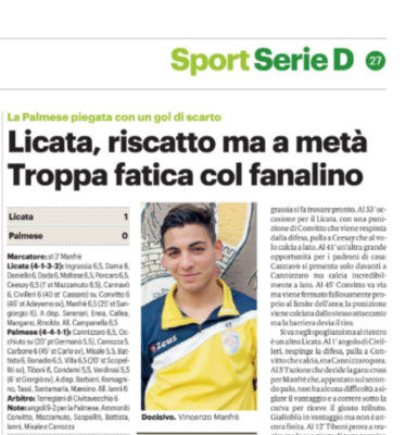 L'edizione odierna del "Giornale di Sicilia" si sofferma sulla vittoria del Licata contro la Palmese. Una gara non bella a vedersi...