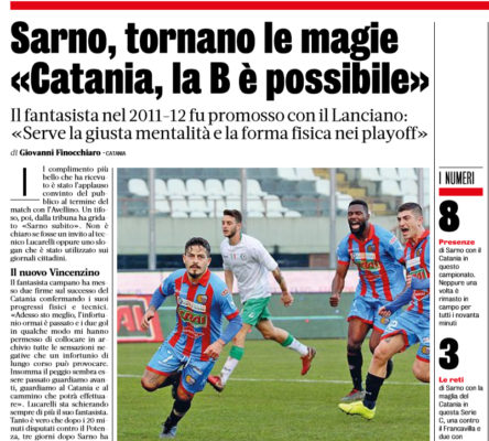 L'edizione odierna della "Gazzetta dello Sport" riporta le dichiarazioni di Vincenzo Sarno, fantasista del Catania: «Guardiamo al Catania e al cammino...