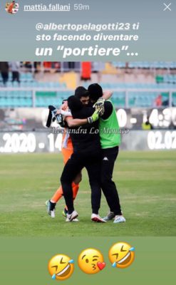 Attraverso le proprie storie su instagram Fallani scherza con Alberto Pelagotti dopo il match vinto contro il Roccella. In alto...