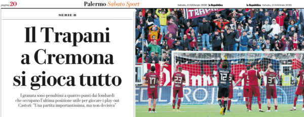 L'edizione odierna de "La Repubblica" si sofferma sull'ultima spiaggia del Trapani. La sfida contro la Cremonese sarà un crocevia fondamentale....