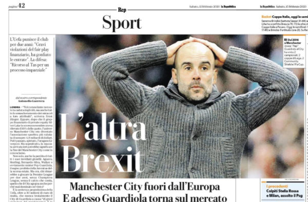 L'edizione odierna de "La Repubblica" si sofferma sull'esclusione del Manchester City dalla Champions League per le prossime due stagioni. Il...