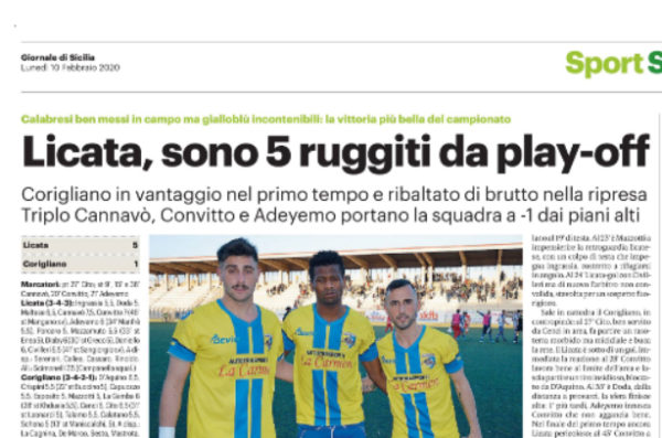 L'edizione odierna del "Giornale di Sicilia" esalta la larga vittoria del Licata sul Corigliano. Bomber Cannavò trascina il Licata nella vittoria...