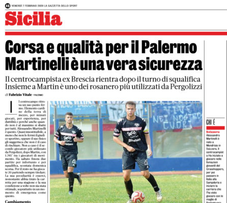L'edizione odierna della "Gazzetta dello Sport" parla del rientro di Martinelli. Il centrocampo del Palermo ritrova un suo punto fermo...