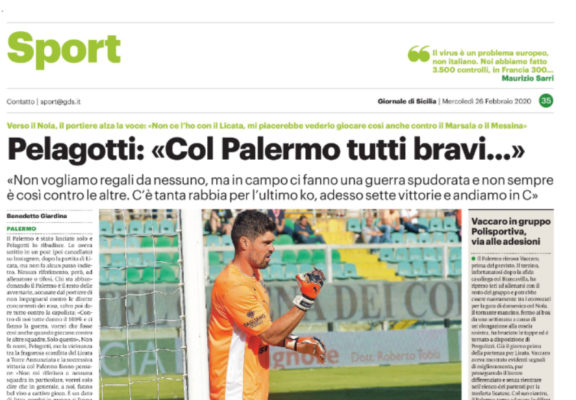L'edizione odierna del "Giornale di Sicilia" riporta le dichiarazioni in conferenza stampa di Alberto Pelagotti, portiere del Palermo: «Contro di noi...