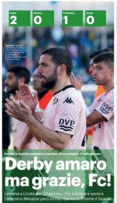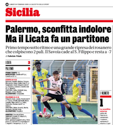 L'edizione odierna della "Gazzetta dello Sport" parla della prima sconfitta del Palermo a Licata in trasferta che però è indolore....