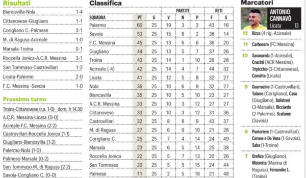 In alto la classifica e il programma completo del prossimo turn del girone I di serie D.