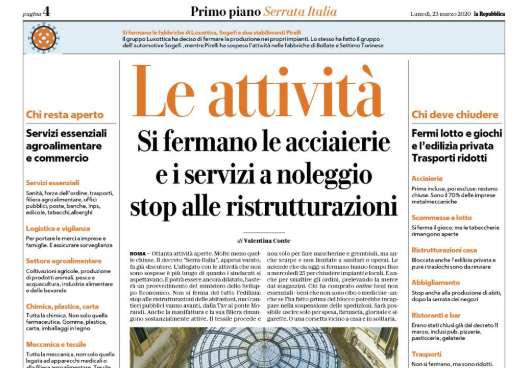 L'edizione odierna de "La Repubblica" si sofferma sul decreto "Serra-Italia". Non si ferma del tutto l’edilizia: stop alle ristrutturazioni delle abitazioni,...
