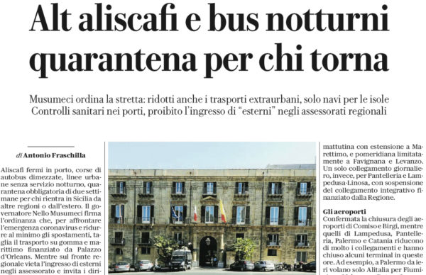 L'edizione odierna di "Repubblica" parla della nuova ordinanza del presidente della Regione Musumeci. Aliscafi fermi in porto, corse di autobus...