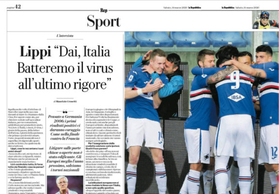 L'edizione odierna di "Repubblica" parla dello stop delle coppe europee. Alla fine la Uefa s’è arresa. Di fronte all’effetto domino...