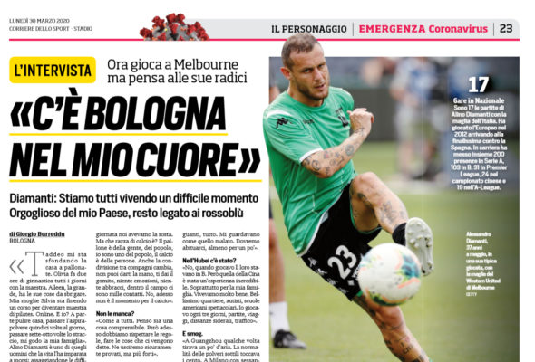 Corriere dello Sport: “Diamanti «C’è Bologna nel mio cuore. In Cina…»”