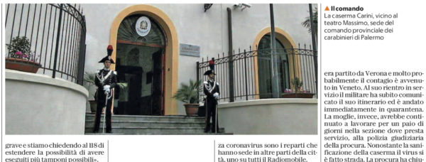 L'edizione odierna de "La Repubblica - Palermo" si sofferma sui dieci carabinieri infetti a Palermo. La caserma "Carini" è stata...