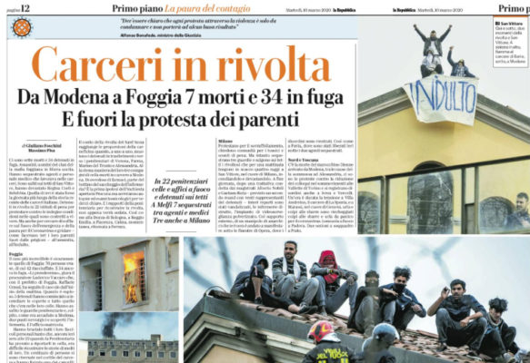 Repubblica: “Italia, paura del contagio. Carceri in rivolta, da Modena a Foggia 7 morti e 34 in fuga. E fuori la protesta dei parenti”