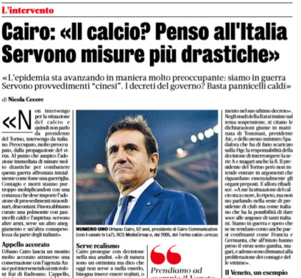 Urbano Cairo, presidente del Torino, ha voluto dire la sua sull'emergenza Coronavirus che si è abbattuta in Italia. Queste le...