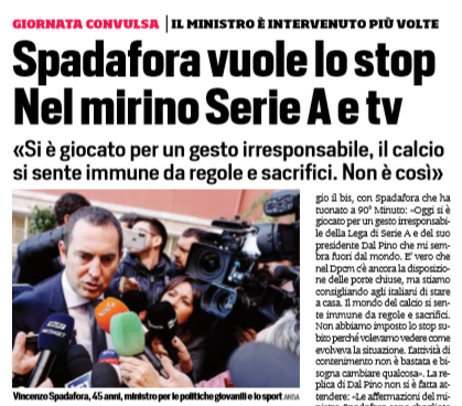 L'emergenza Coronavirus in Italia continua, ma ieri il calcio non si è fermato. La prima pagina dell'edizione odierna del "Corriere...