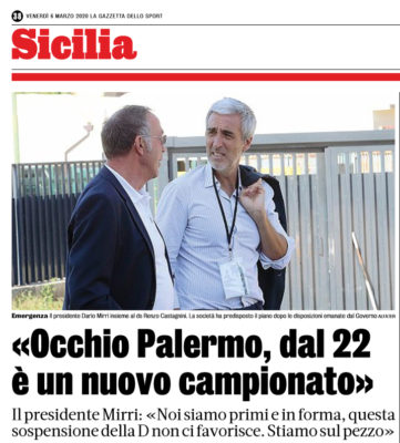 L'edizione odierna della "Gazzetta dello Sport" riporta le dichiarazioni di Dario Mirri, presidente del Palermo, in merito allo stop della...