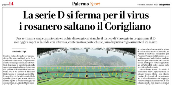 Repubblica: “La serie D si ferma per il virus, i rosanero saltano il Corigliano. Oggi il nuovo calendario, le ultime”