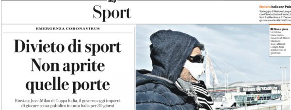 L'edizione odierna de "La Repubblica" si sofferma sull'allarme Coronavirus nel mondo dello sporte. Porte chiuse per tutti, per 30 giorni:...
