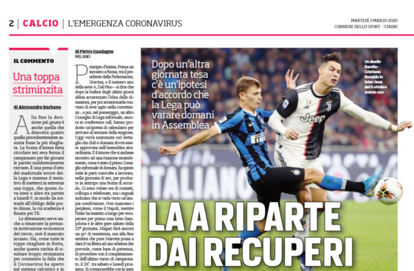 Corriere dello Sport: “La A riparte dai recuperi. Turno infrasettimanale a maggio. Resta un’incognita…”