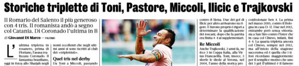 L'edizione odierna della "Gazzetta dello Sport" esalta la tripletta di Floriano, rammentando i grandi tris del passato. L'ultimo ad averla...
