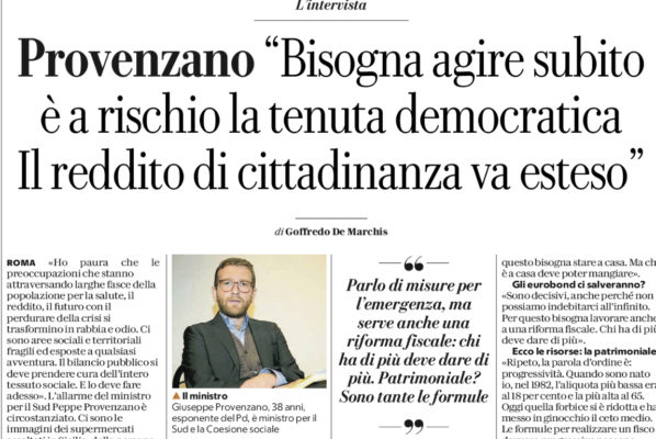 Repubblica: “Sud vicino alla rivolta sociale. Il Ministro «Bisogna agire subito è a rischio la tenuta democratica, il reddito di cittadinanza va esteso»”
