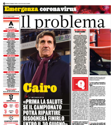 L'edizione odierna de "La Gazzetta dello Sport" ha intervistato il presidente del Torino Urbano Cairo in merito all'emergenza e alla...