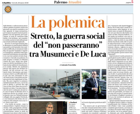 Repubblica: “La polemica Stretto, la guerra social del “non passeranno” tra Musumeci e De Luca”