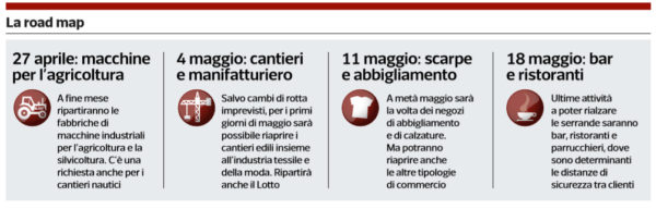L'edizione odierna del "Corriere della Sera" riporta il calendario della Fase 2. Dal 4 maggio ci sarà l'allentamento dei divieti...